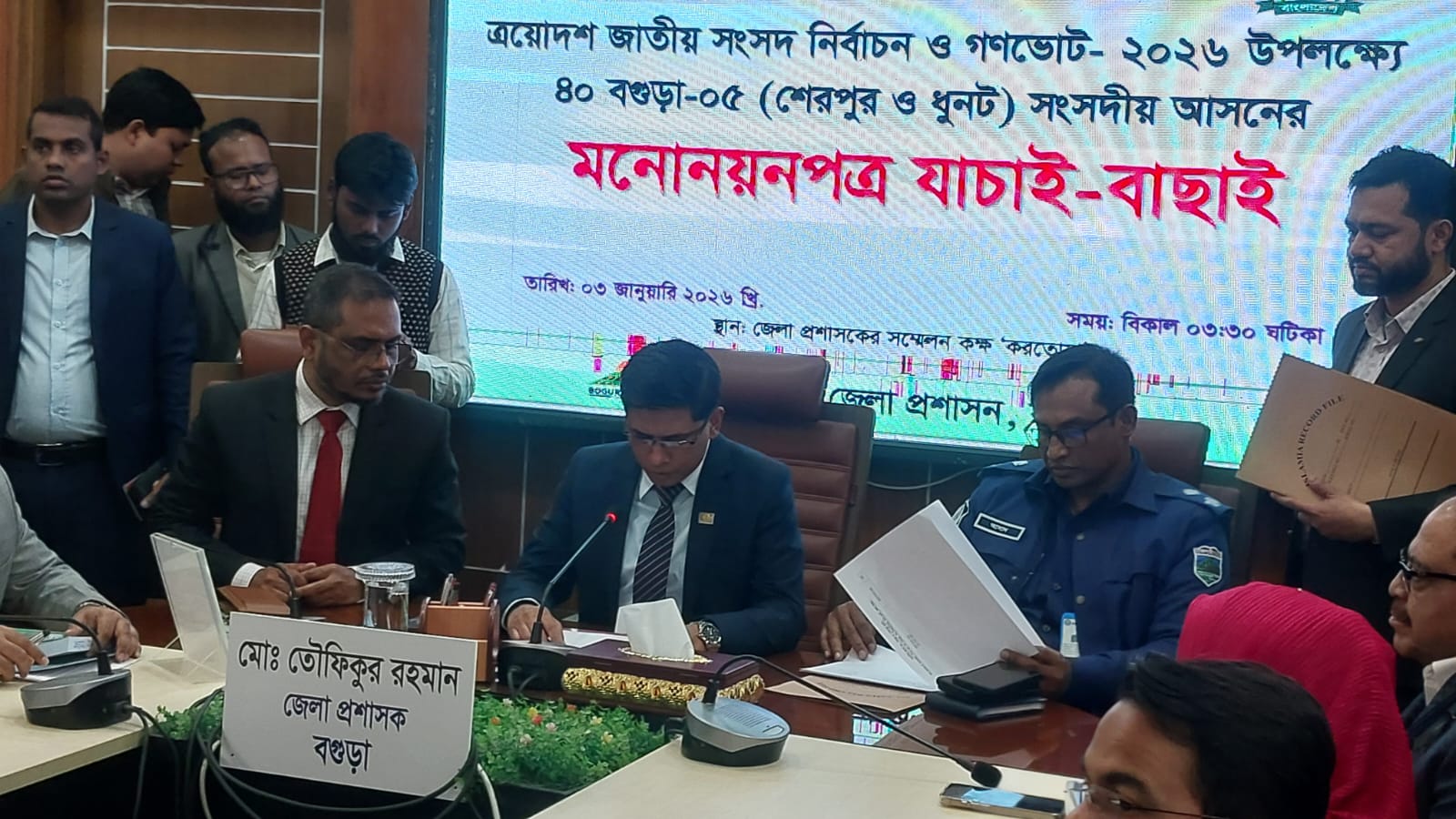 ত্রয়োদশ জাতীয় সংসদ নির্বাচনে বগুড়ায় ৩৯ টি মনোনয়নের মধ্যে ২৬ জনের প্রার্থীতা বৈধ ঘোষণা করেছেন বগুড়া জেলা প্রশাসক ও রিটার্নিং কর্মকর্তা মো. তৌফিকুর রহমান।শনিবার (৩ ডিসেম্বর) বিকেলে জেলা প্রশাসকের সভাকক্ষে মনোনয়ন বাছাই শেষে এই তথ্য জানান তিনি। এর আগে শুক্রবার থেকে মনোনয়ন যাচাই বাছাই শুরু হয়।